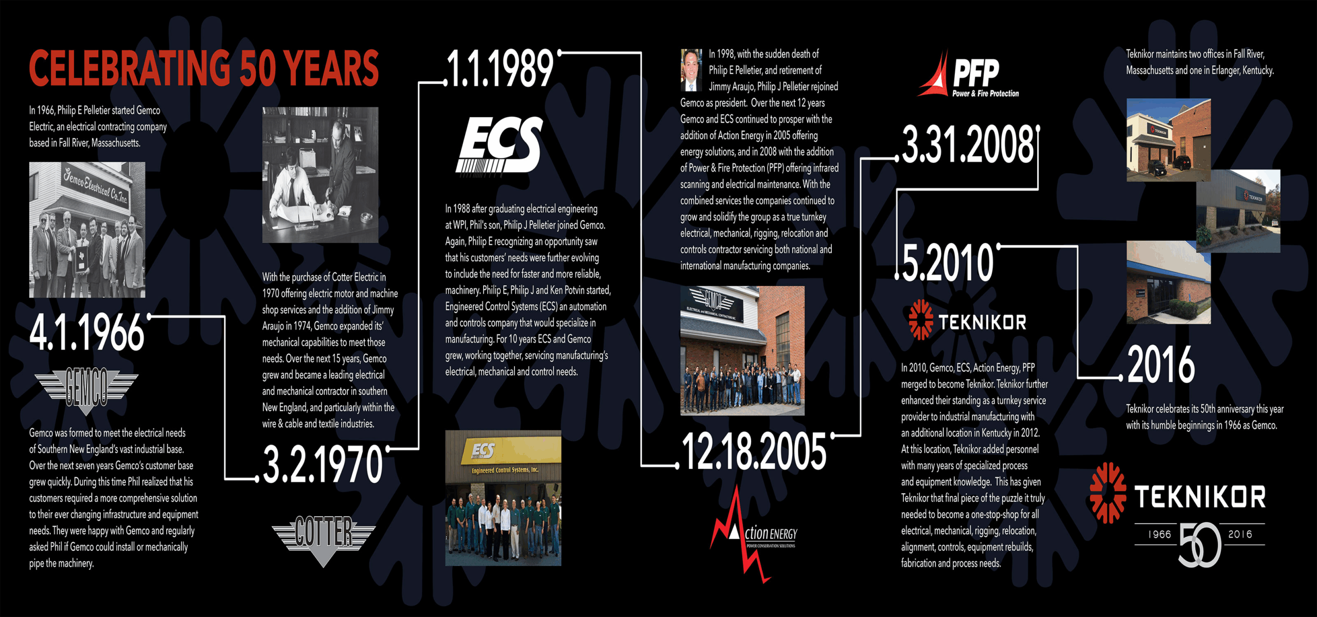 Teknikor traces its origins to 1966, when electrical contractor Philip E. Pelletier established Gemco Electric in Fall River, Massachusetts. Initially founded to address the electrical requirements of southern New England’s industrial sector, Gemco quickly developed a broad customer base. Recognizing his clients’ evolving infrastructure and equipment needs, Mr. Pelletier expanded Gemco’s services beyond electrical work to include machinery installations and mechanical piping.